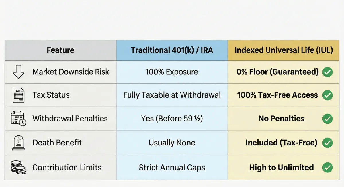 In a 401(k), your money is 100% at risk in the market and you pay taxes when you withdraw it. In an IUL, your money has a 0% floor (no market loss) and you can access the cash value tax-free through policy loans.